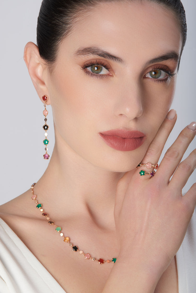 Contrarié-Ring aus 18 Karat Roségold mit grünem Achat, rotem Karneol, Onyx, weißem Mondstein, rosa Chalcedon, Citrin, Amethyst, London Blue Topas und weißen Diamanten.