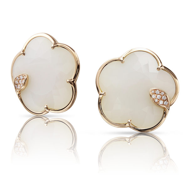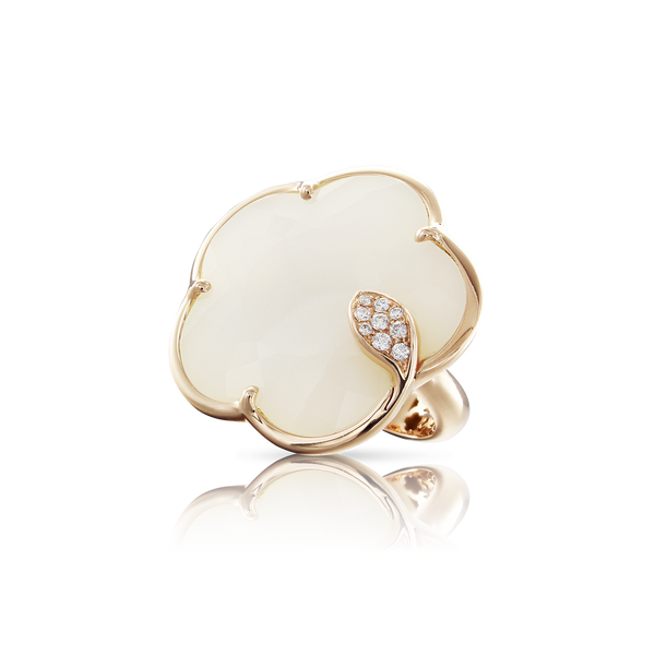 Ton Joli maintains the delicate faceting of the taglio Bon Ton, an exclusive Pasquale Bruni patented cut. The collection reinterprets the five-petals iconic flower of the Maison in new sophisticated proportions. Gems blend into a rose gold flower, wrapped in a leaf of white and champagne diamonds.