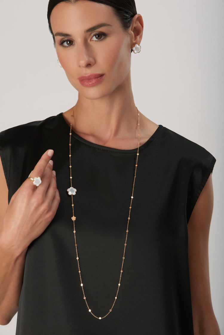 Sautoir en or rose 18 carats avec quartz laiteux et diamants.