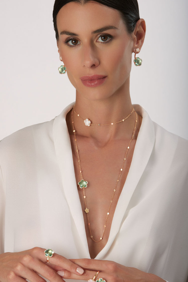 Sautoir multi-chaîne en or rose 18 carats avec prasiolite, quartz laiteux et diamants.