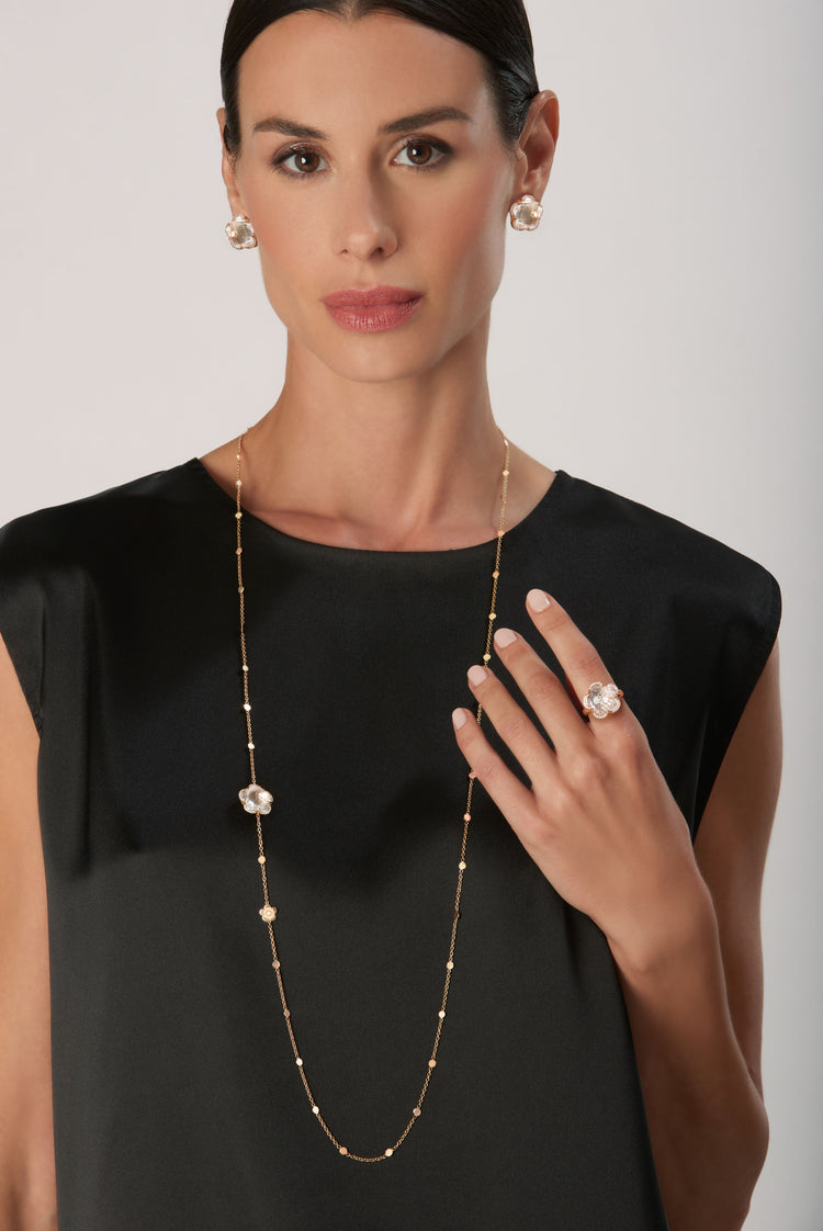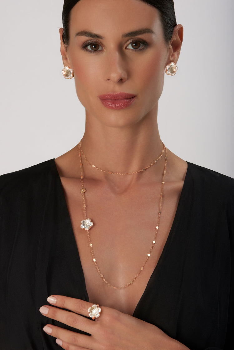 La transparence pure et brillante du Cristal de Roche abrite une fleur précieuse en diamants blancs et champagne vibrant dans le mystère de l'or rose. Ce bijou symbolise la beauté de la lumière intérieure qui rayonne joyeusement dans le monde.