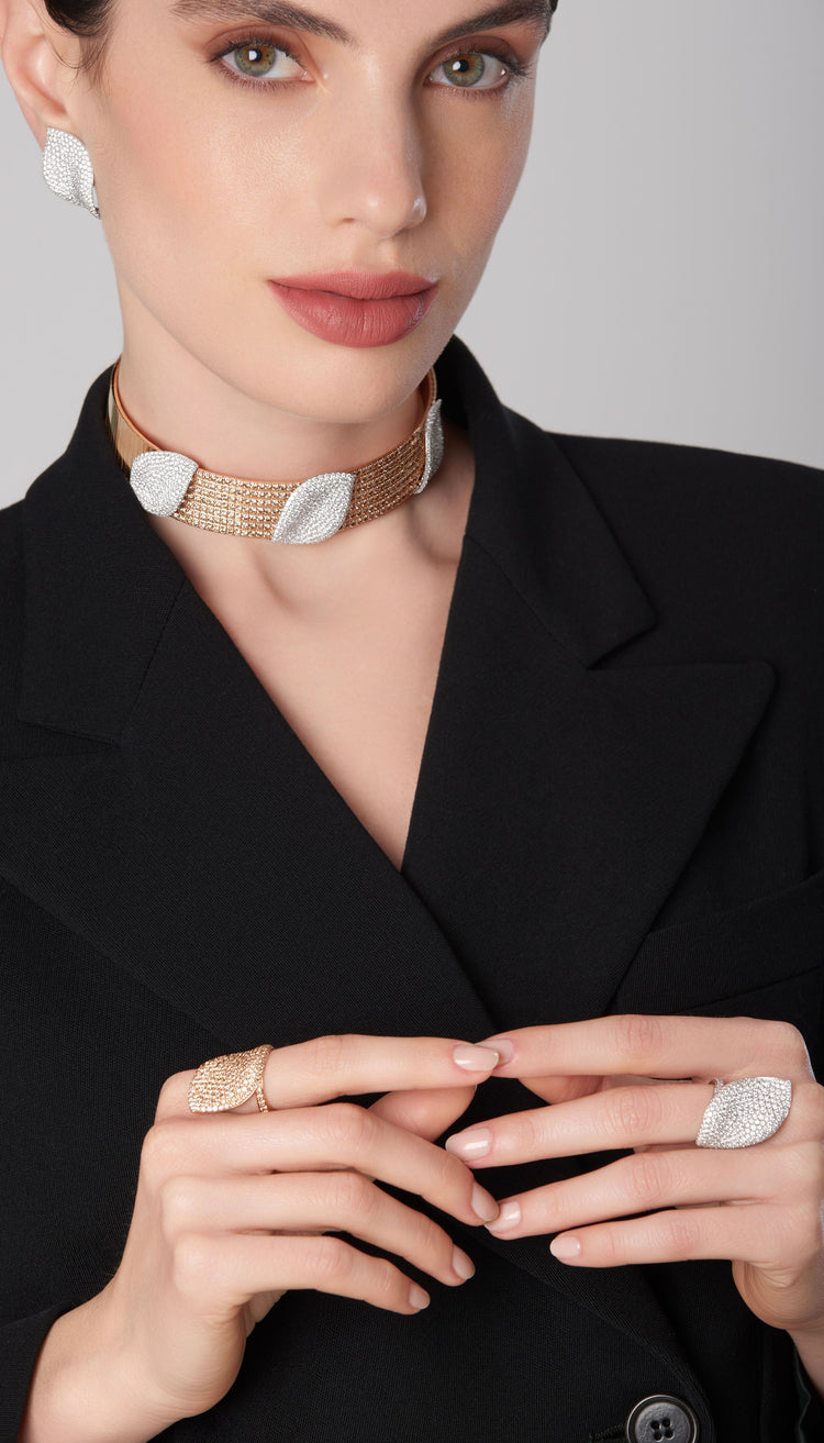 Bague XL en or rose 18 carats avec diamants blancs et champagne.