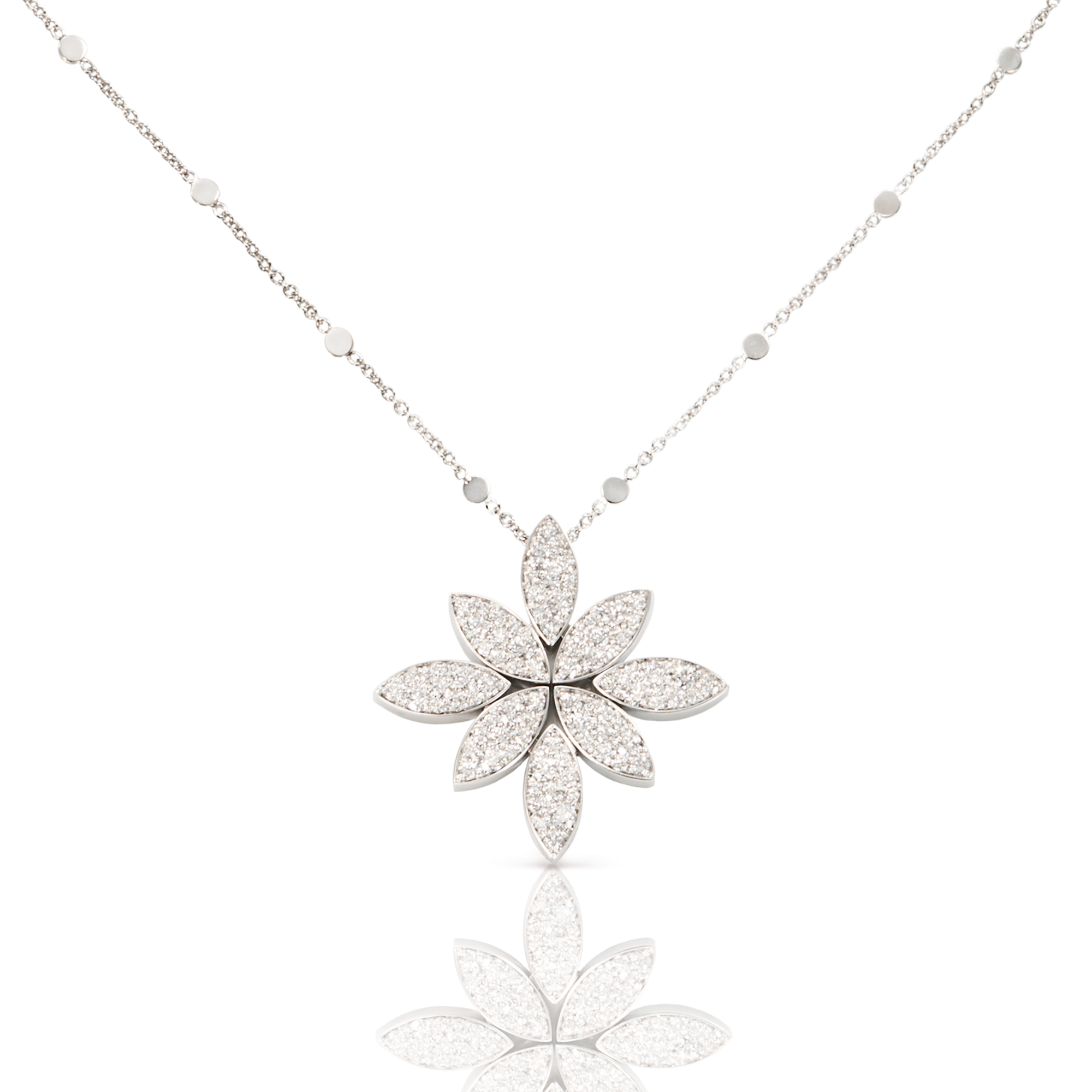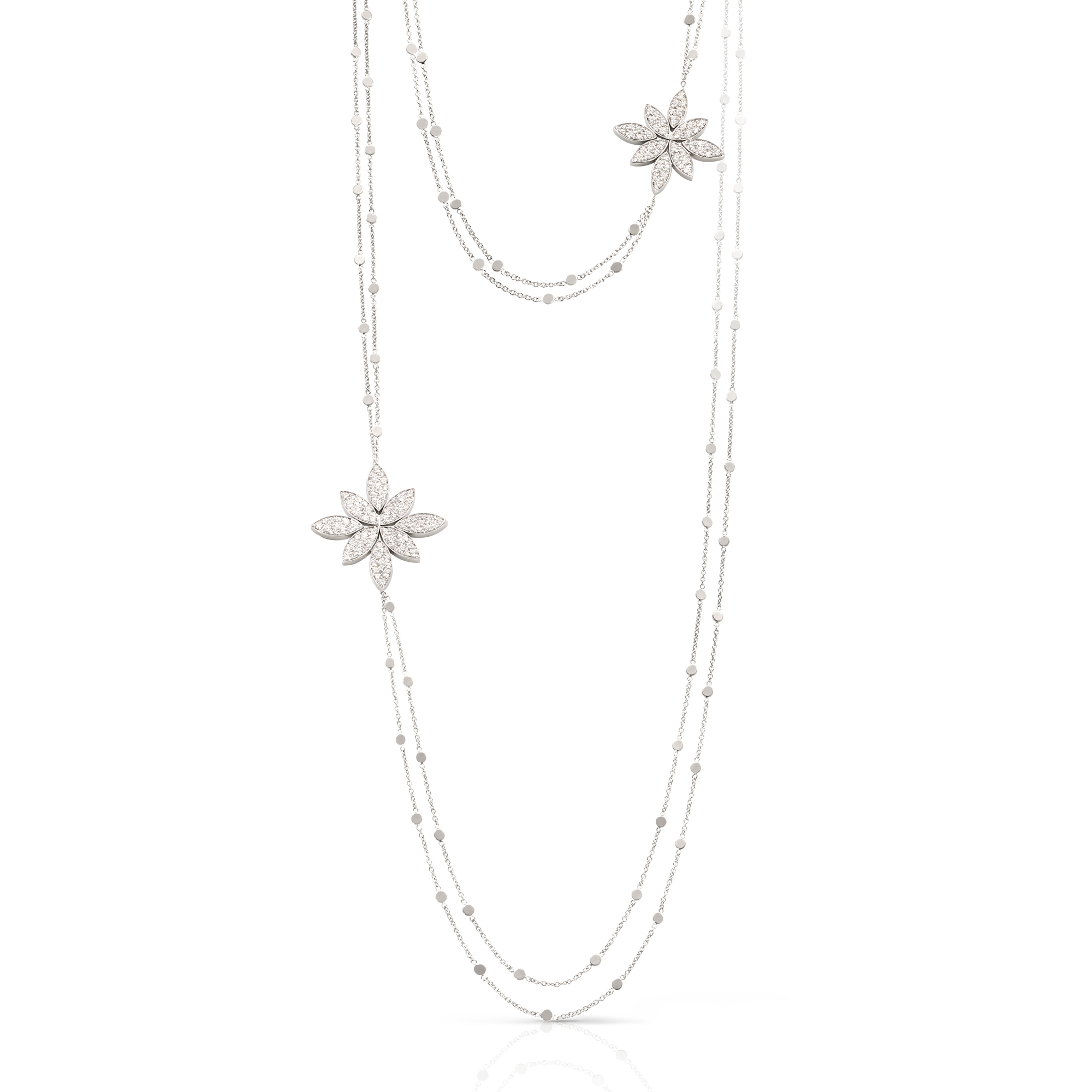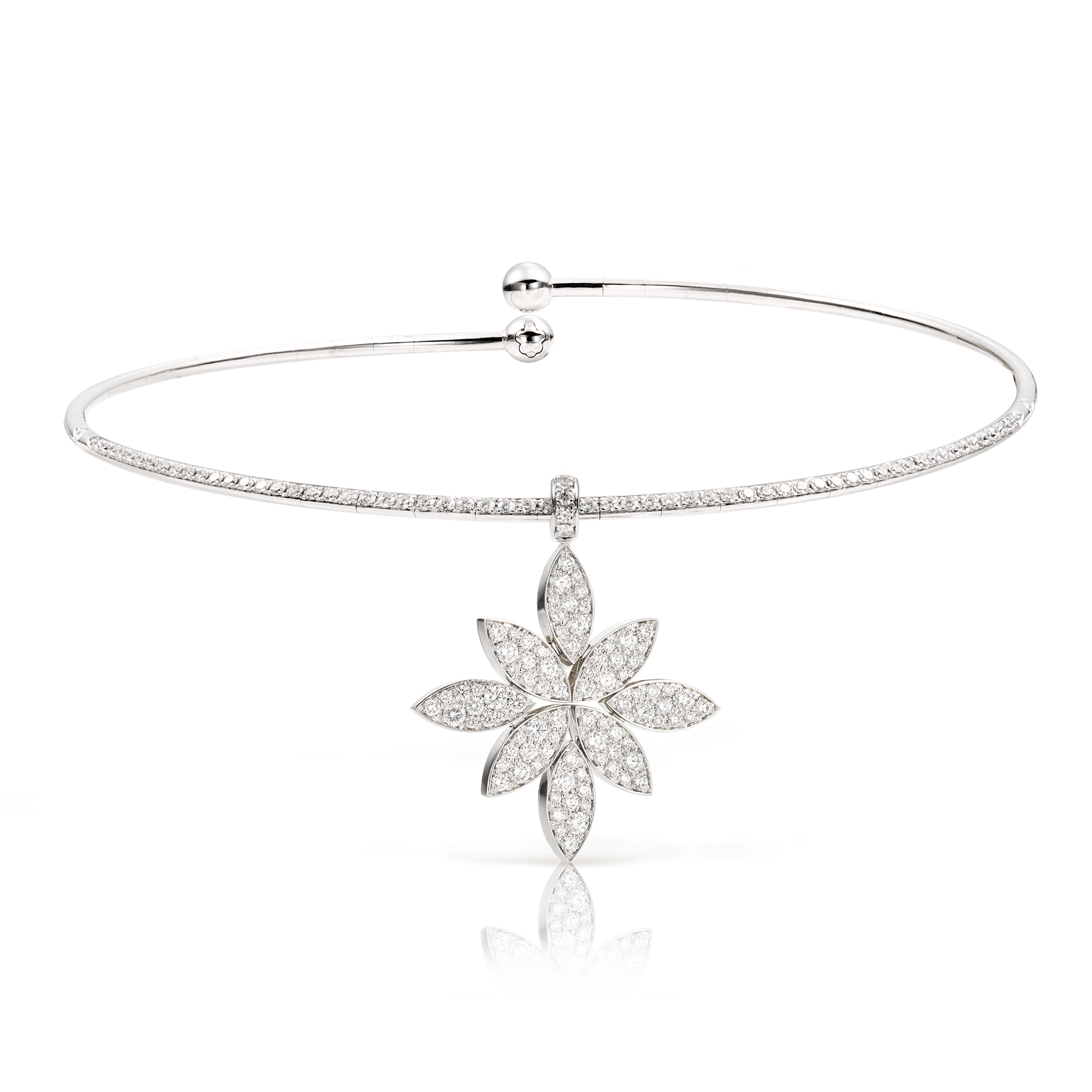 La maestria di 30 anni di alta artigianalità italiana prende forma in questa magnifica collezione ispirata al movimento dei fiori e delle foglie, da sempre simboli della Maison. Una leggera danza di petali che sembrano poggiarsi delicati e sinuosi sul corpo della donna, accendendola di sensuali e romantici bagliori di pietre preziose e diamanti.