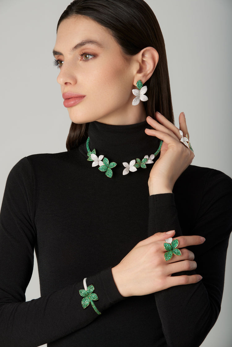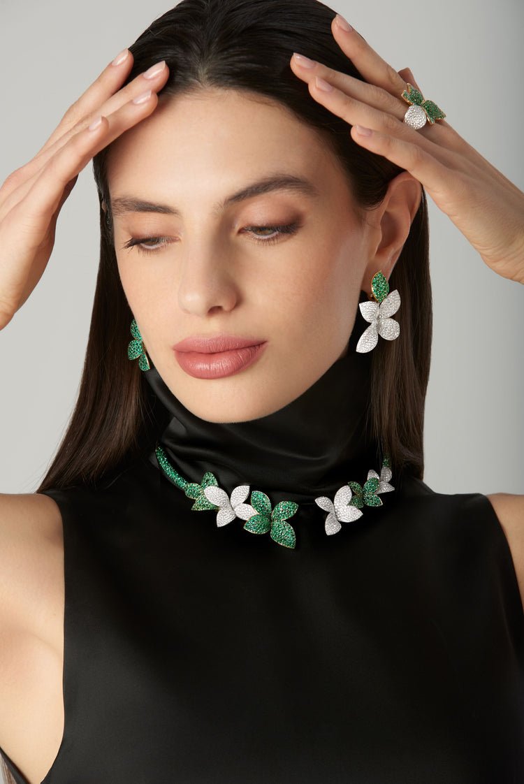 Collier in 18 karaat wit- en geelgoud met diamanten en smaragden.